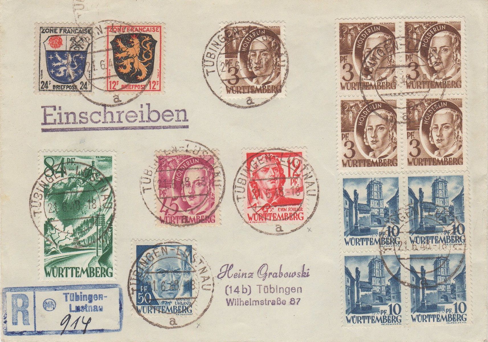 Brief aus Schwenningen am Neckar und lief nach Stuttgart. Der Brief wurde am 21.06.1948 aufgegeben und mit dem dortigen Poststempel gegen 15 Uhr entwertet. Am 21.06.1948 war die Währungsreform in den Westzonen. Die Reichsmark verlor ihre Gültigkeit und die Deutsche Mark wurde eingeführt, im Umrechnungsfaktor 10 Reichsmark = 1 Deutsche Mark. So erklärt sich auch das Aufgeklebte Porto von insgesamt 4 x 60 Reichspfennig = 240 Reichspfennig, also umgerechnet 24 Pfennig. Diese sogenannten Zehnfachfrankaturen waren in der Französischen Zone nicht erlaubt, wurden aber geduldet. Freigemacht wurde der Brief im Fernverkehr bis 20g Protorichtig mit 4 x MiNr.: 10 vom rechten unteren Bogenrand mit Druckdatum 6.2.1948.