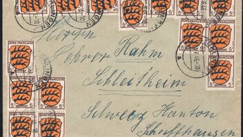 Auslandsbrief bis 20g, aufgegeben am 3 Juni 1946 in der Französischen Zone Baden in Stühlingen und lief in die Schweiz in das Kanton Schaffhausen. Entwertet wurde der Brief mit dem Poststempel STÜHLINGEN, Kennbuchstabe a. Freigemacht wurde der Brief mit 15x5RPf, Massenfrankatur MiNr.: 3, also gesamt 75RPf. Dies entspricht der geltenden Portostufe, ab 01.04.1946, für Briefe ins Ausland. Der Brief ist damit Portorichtig freigemacht und wurde ohne Zensur in die Schweiz befördert.