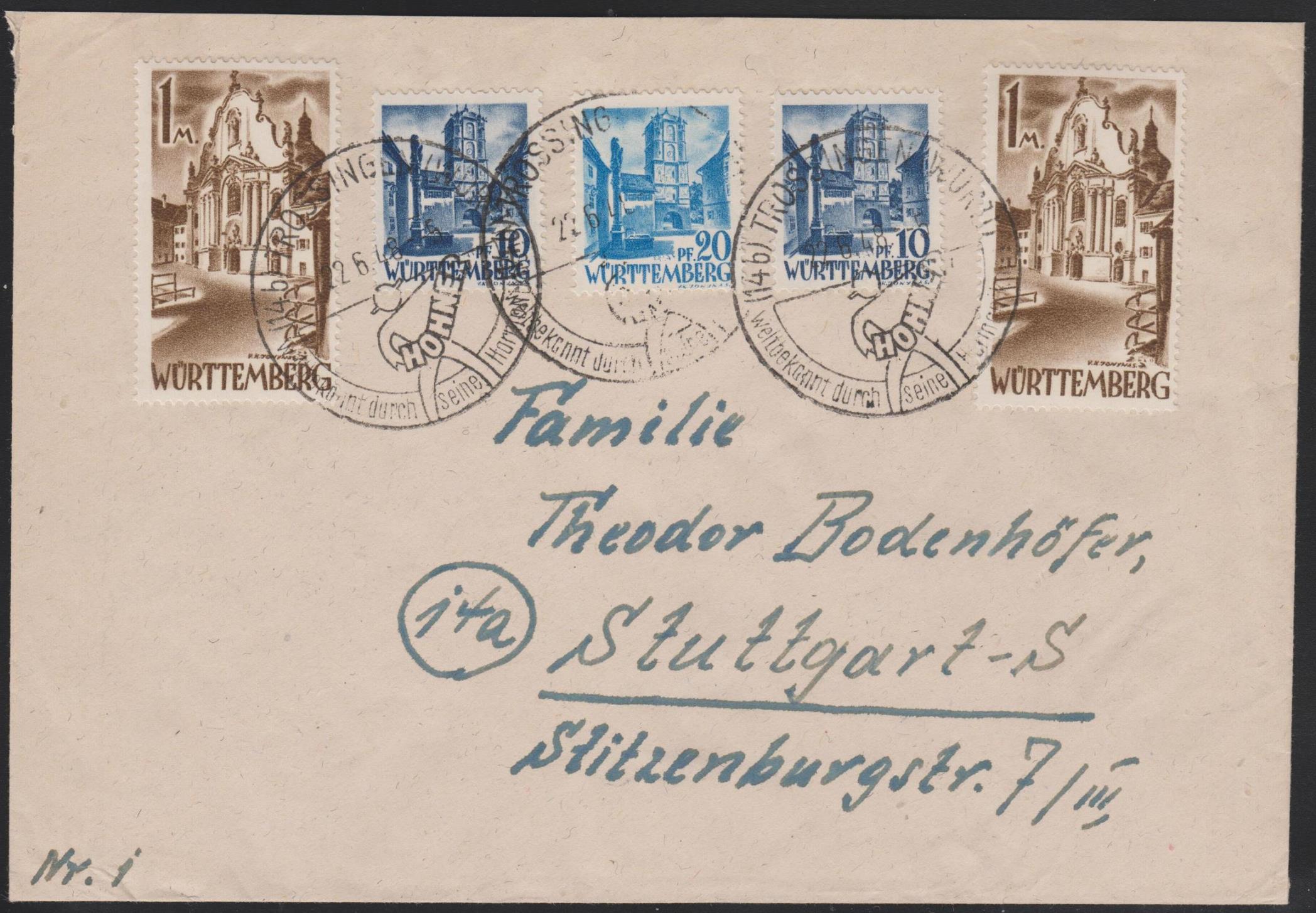 heute mal wieder eine Zehnfachfrankatur, ich habe eine neue Philatelistische "Liebe" entdeckt :ups:. Aufgegeben am 22.06.1948 in Trossingen. Auf dem Brief wurde auch noch ein Sonderstempel aus Trossingen abgeschlagen zu Ehren von Hohner dem Akkordeon Hersteller. Der Brief ist portogerecht freigemacht mit 240RPf, entspricht also 24Pf.