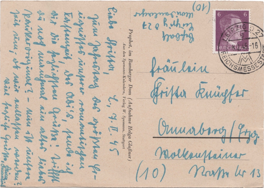 gleich im Anschluss habe ich einen Brief vom 17.07.1945 vom Postamt W 31zum zeigen. Der offizielle Start der Post für das allgemeine Publikum war ja nach bisherigen Erkenntnisstand der 20.07.1945. In den ersten Tage war die Versendung grundsätzlich nur innerhalb der Stadt möglich. Stutzig macht mich der Stempel vom Postamt W 31 und die verwendete Farbe. der Kennbuchstabe b ist im unteren Teil des Stempelbogens. Es fehlt das Doppel-M und der Schriftzug Reichsmessestadt. Der Stempel muss, wenn es sich um einen echten Stempel handelt, eher Innendienst verwendet worden sein. Den Adressaten kann es gegeben haben. Die Frankfurter Strasse ist eine Hauptstrasse in Groß Gerau (heute Zubringer von der Autobahn A67 zum Stadtzentrum). Es gibt auch heute noch Familien mit dem Namen Fritsch dort.