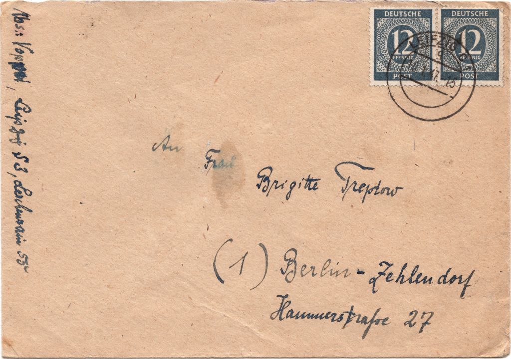 gleich im Anschluss habe ich einen Brief vom 17.07.1945 vom Postamt W 31zum zeigen. Der offizielle Start der Post für das allgemeine Publikum war ja nach bisherigen Erkenntnisstand der 20.07.1945. In den ersten Tage war die Versendung grundsätzlich nur innerhalb der Stadt möglich. Stutzig macht mich der Stempel vom Postamt W 31 und die verwendete Farbe. der Kennbuchstabe b ist im unteren Teil des Stempelbogens. Es fehlt das Doppel-M und der Schriftzug Reichsmessestadt. Der Stempel muss, wenn es sich um einen echten Stempel handelt, eher Innendienst verwendet worden sein. Den Adressaten kann es gegeben haben. Die Frankfurter Strasse ist eine Hauptstrasse in Groß Gerau (heute Zubringer von der Autobahn A67 zum Stadtzentrum). Es gibt auch heute noch Familien mit dem Namen Fritsch dort.