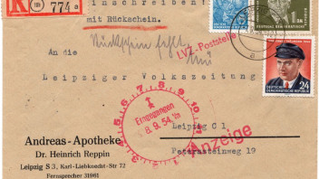 ich habe mal wieder einen interessanten Beleg mit gleich zwei aptierten Stempel aus Leipzig. Der Einschreibebrief wurde am 6.10.1952 nach Berlin versandt. In Berlin war das Haus durch den Krieg zerstört worden. Das Postamt Berlin W 35 konnte die neue Adresse nicht ermitteln und sendete den Brief wieder zurück. Interessant sind die beiden Berliner Nebenstempel. Der Aufgabestempel (10) LEIPZIG C 2 Kb x und der Ankunftsstempel LEIPZIG N 22 Kb l sind aptiert worden.