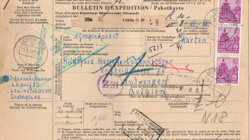 die Letztverwendung des aptierten Stempels Leipzig O 39 Kb b kann ich gut 9 1/2 Jahre nach hinten verschieben. Hier auf einer Paketkarte von Leipzig nach Antwerpen (Belgien) vom 17.01.1958 ist er gleich dreimal abgeschlagen worden.