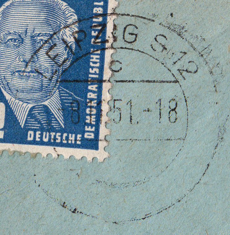 den bereits oben gezeigten Stempel LEIPZIG C2 Kb l kann ich beim Datum nochmal um eine knappe Woche nach hinten auf den 14.09.1952 schieben. Anscheinend wurden die Aptierungen nachgearbeitet. Im Gegensatz zu dem Beleg vom 08.09.1952 ist im unteren Bereich des Stempels kaum noch etwas zu erkennen.