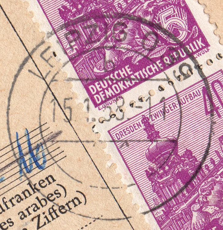 die Letztverwendung des aptierten Stempels Leipzig O 39 Kb b kann ich gut 9 1/2 Jahre nach hinten verschieben. Hier auf einer Paketkarte von Leipzig nach Antwerpen (Belgien) vom 17.01.1958 ist er gleich dreimal abgeschlagen worden.