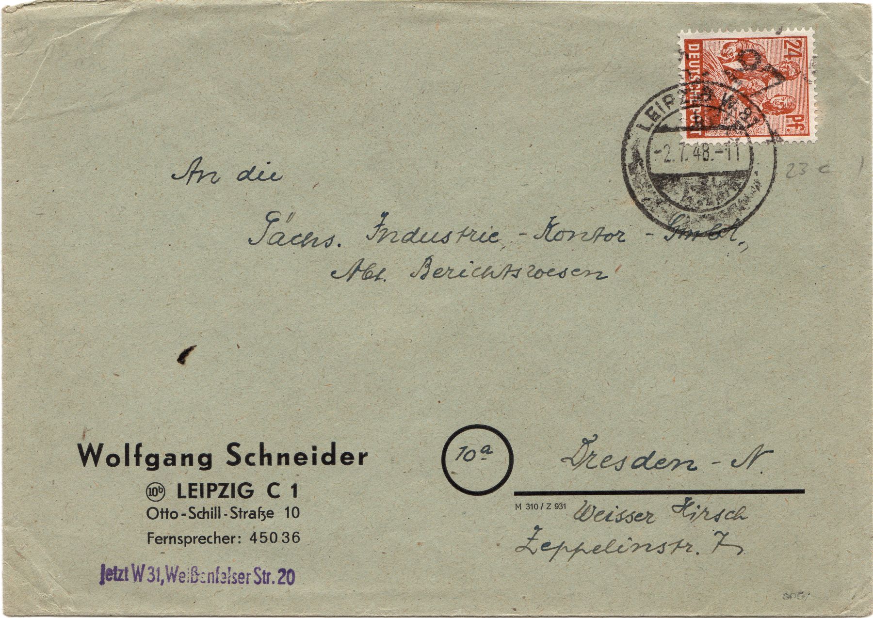 ich habe mal wieder einen interessanten Beleg mit gleich zwei aptierten Stempel aus Leipzig. Der Einschreibebrief wurde am 6.10.1952 nach Berlin versandt. In Berlin war das Haus durch den Krieg zerstört worden. Das Postamt Berlin W 35 konnte die neue Adresse nicht ermitteln und sendete den Brief wieder zurück. Interessant sind die beiden Berliner Nebenstempel. Der Aufgabestempel (10) LEIPZIG C 2 Kb x und der Ankunftsstempel LEIPZIG N 22 Kb l sind aptiert worden.
