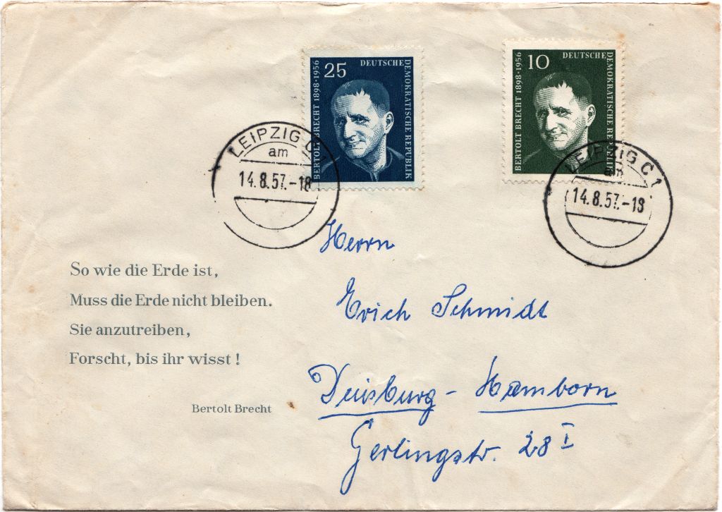 hier ein neues Stempelgerät. Leipzig C 1 Kb am vom 14.08.1957 (Ersttag MiNr.593-594) nach Duisburg mir 15 Pfennig überfrankiert.