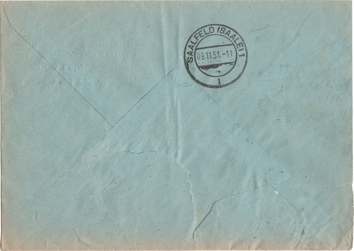 gleich hinterher vom Postamt LEIPZIG S 12 mit dem Kb c vom 8.11.1951 auf einem Einschreibebrief nach Saalfeld.