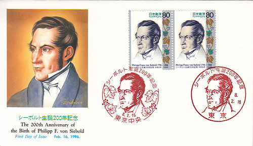 Zum 200. Geburtstag von Philipp Franz von Siebold erschien 1996 eine Gemeinschaftsausgabe von Deutschland (Michel-Nr. 1842) und Japan (Mi.-Nr. 2365). Von Siebold war unter anderem ein bekannter Japan-Forscher und wurde in 4 Jahren, die er in Japan verbrachte, dort hoch verehrt. Die beiden Marken sind nicht bildgleich, aber die Abbildung von Siebold ist bei beiden identisch. Einen Kombibeleg mit beiden Marken habe ich nicht gefunden: