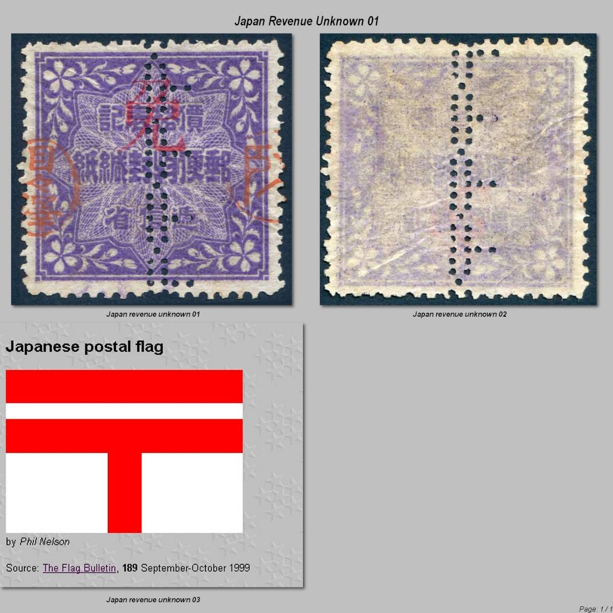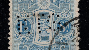 Die Marke ist aus Japan und es handelt sich dabei nicht um ein Perfin. Die Lochung stellt die japanische Postflagge dar und man geht davon aus, dass sie nicht nur für Steuermarken, sondern zudem als Siegel für Geldsendungen eingesetzt wurde.