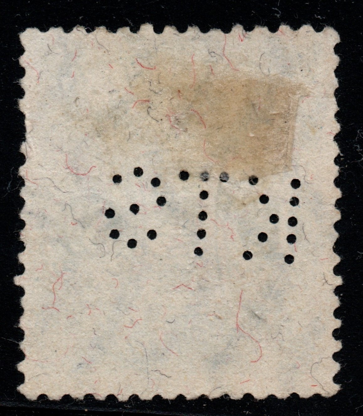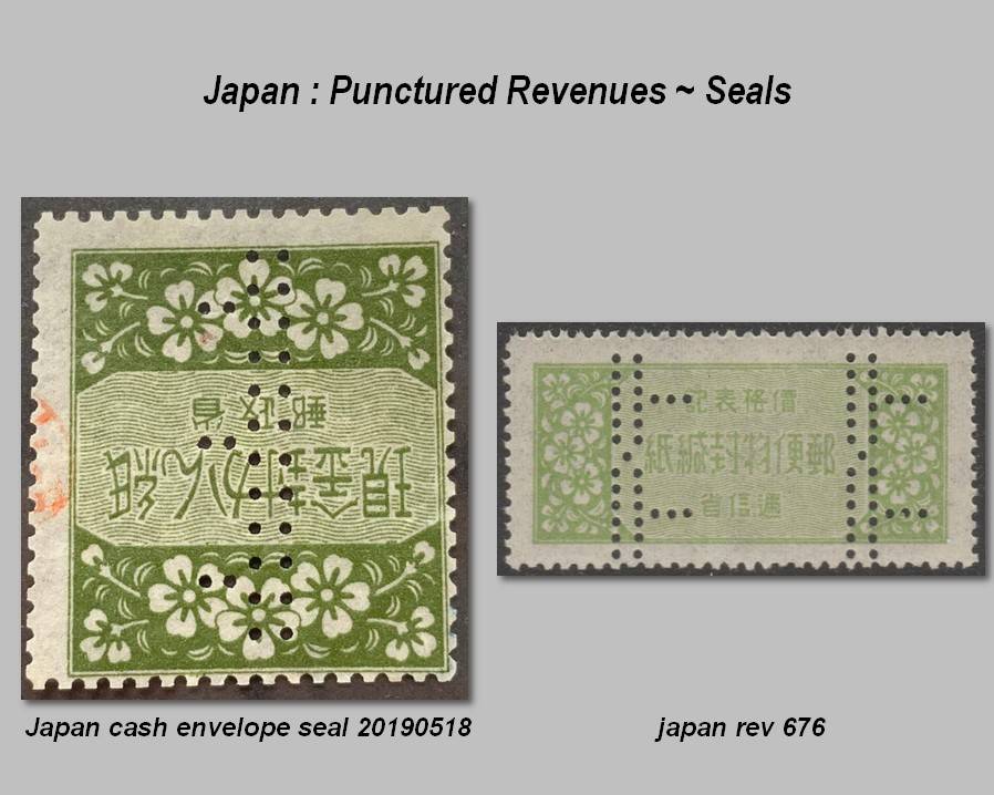 Die Marke ist aus Japan und es handelt sich dabei nicht um ein Perfin. Die Lochung stellt die japanische Postflagge dar und man geht davon aus, dass sie nicht nur für Steuermarken, sondern zudem als Siegel für Geldsendungen eingesetzt wurde.