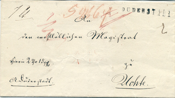 Geldbrief um 1820 nach Uchte mit Langstempel DUDERSTADT und Vermerk.