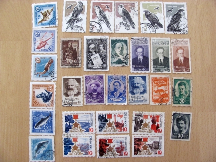 die Marken links am Rand, die Marken der obersten Reihe und die sechs bunten Marken unten sind Marken, wie man sie massenhaft in Kaufhauspäckchen vorfindet, also Massenware für Sammler. Die restlichen Marken in der Mitte sehen eher wie Marken aus, die für einen echten postalischen Bedarf hergestellt worden waren, da müsste man mal in den Katalog schauen; da aber in der Sowjetunion (nicht: Russland, das war vorher und nach 1992) ungeheuer viele Marken erschienen sind, wäre es hilfreich dafür das Ausgabejahr oder zumindest das Stempeldatum zu kennen, um die Marken ohne zu viel Zeitaufwand finden zu können.