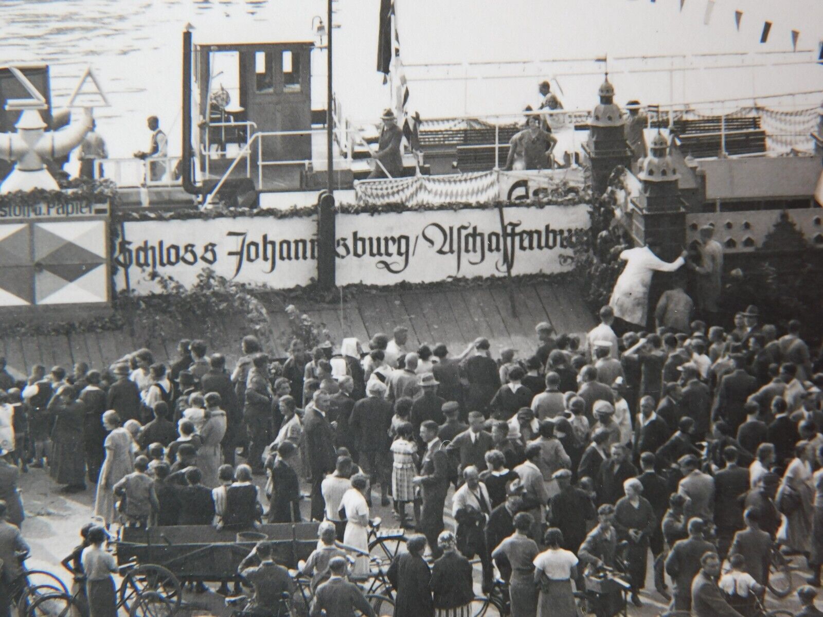 Einen erbitterten Zweikampf lieferten sich hier 2 Aschaffenburger Sammler, der vor kurzem mit 261,- EUR endete. Der Startpreis war 3,90 EUR. Die letzten 2 Gebote waren vom selben Sammler, er hätte wohl auch 500,- EUR dafür bezahlt und wollte diese Karte unbedingt haben. Wohl eine sehr seltene Foto-AK, die den Hafen von Aschaffenburg zeigt, ein Flußschiff mit einer großen Menschenmenge. Ob das Schiff "Schloss Johannisburg" hieß oder ob es nur an diesem Schloss vorbeifuhr, konnte ich nicht herausfinden. Das Jahr der Aufnahme ist schwer zu schätzen, es könnte auch um 1910 gewesen sein.