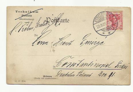Mal was anderes: Postkarte (Technikum Mecklenburg Strelitz) aus Strelitz an das Deutsche Postamt Constantinopel, postlagernd an einen Hörer aus der Türkei.