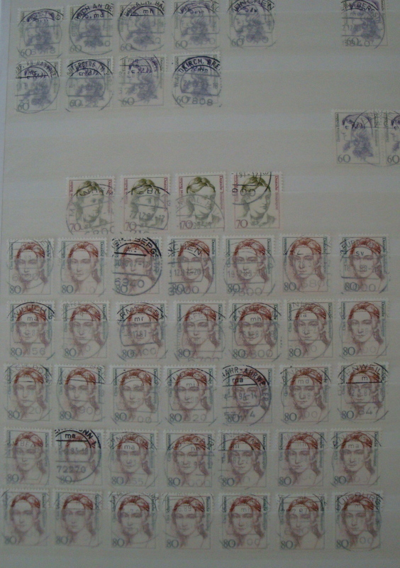 Ich habe in der Sammlung "Bund gestempelt" bewusst die Freimarken mit aufgenommen, denn diese Sammlung soll tatsächlich jede einzelne Nummer ab 111 bis 2155 enthalten. Also auch alle Freimarken, auch die Blockmarken, auch die selbstklebenden (da muss ich mich korrigieren, bei den gestempelten sind sie dabei, bei den postfrischen nicht, das kommt aber ein anderes mal). Zu den Dauerserien gibt es aber gesonderte und von den anderen getrennte Dublettenbestände und zusätzlich zu fast jeder Dauerserie noch eine Spezialsammlung (wenn gewünscht kann ich da gerne auch mal die ein oder andere zeigen, die Alben sieht man im ersten Beitrag auf dem zweiten bild rechts, Wünsche sind willkommen ;)). Also es gibt (für Bund gestempelt) die Hauptsammlung strikt nach MiNr, Spezialsammlungen zu den Dauerserien, Dubletten zu den Sondermarken und Dubletten zu den Dauerserien. Die Blocks habe ich nicht mit aufgenommen, die haben ein eigenes Album, das ist zum Zeigen nicht allzu spannend, Block 2 bis 53 dürfte jeder schonmal gesehen haben ;) Die Blocks gibts dann zusätzlich nochmal als Dubletten, das sind die beiden Alben im ersten bild rechts oben (eigentlich Briefe-Alben, aber bis zu 20 Blocks übereinander passen perfekt rein).