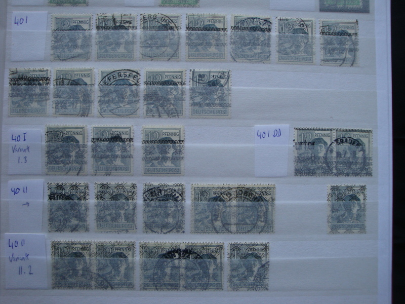 Ich zeige solange kleine Ausschnitte aus dem nächsten Zonen-Album, Gemeinschaftsausgabe Aliierte Besetzung. Hier hab ich noch viel Arbeit vor mir, mit meinem derzeitigen System bin ich irgendwie nicht zufrieden. Für das Gebiet habe ich ganze 3 64-Seiten Alben, eines für gestempelte Standardmarken, eines für postfrische un dieses mit allerlei Besonderheiten, also Farben, Randvermerke, Einheiten (mit Rand), Plattenfehler und sonstige kleinere "Besonderheiten" wie etwa fehlende Zähnungslöcher oder sonstige Druckzufälle. Irgenwie gefällt mir das aber so nicht, ich überlege, es umzustellen auf ein System wie bei der Bizone, also eine Nummer nach der anderen (nach Spezial, also mit Farbvarianten). Dann müsste ich aber wieder die anderen Stücke unterbringen, also bräuchte ich ein zusätzliches Album für Plattenfehler und Besonderheiten, da könnte ich ein 64-Seiten Album nehmen und pro Nummer eine Seite reservieren.
