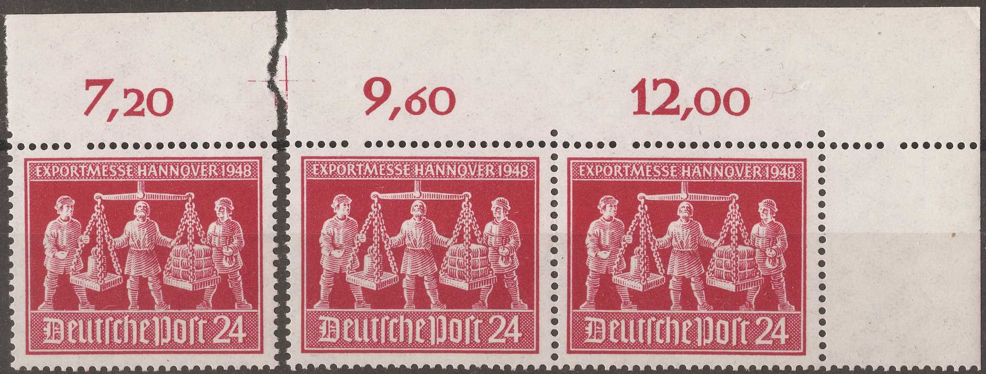 Habe hier drei Marken vom Oberrand der MiNr. 969 mit zwei Plattenfehlern auf Feld 5 "Sporn auf OR über 2. N von "Hannover"" und "1. S von "Exportmesse" unten angebrochen".