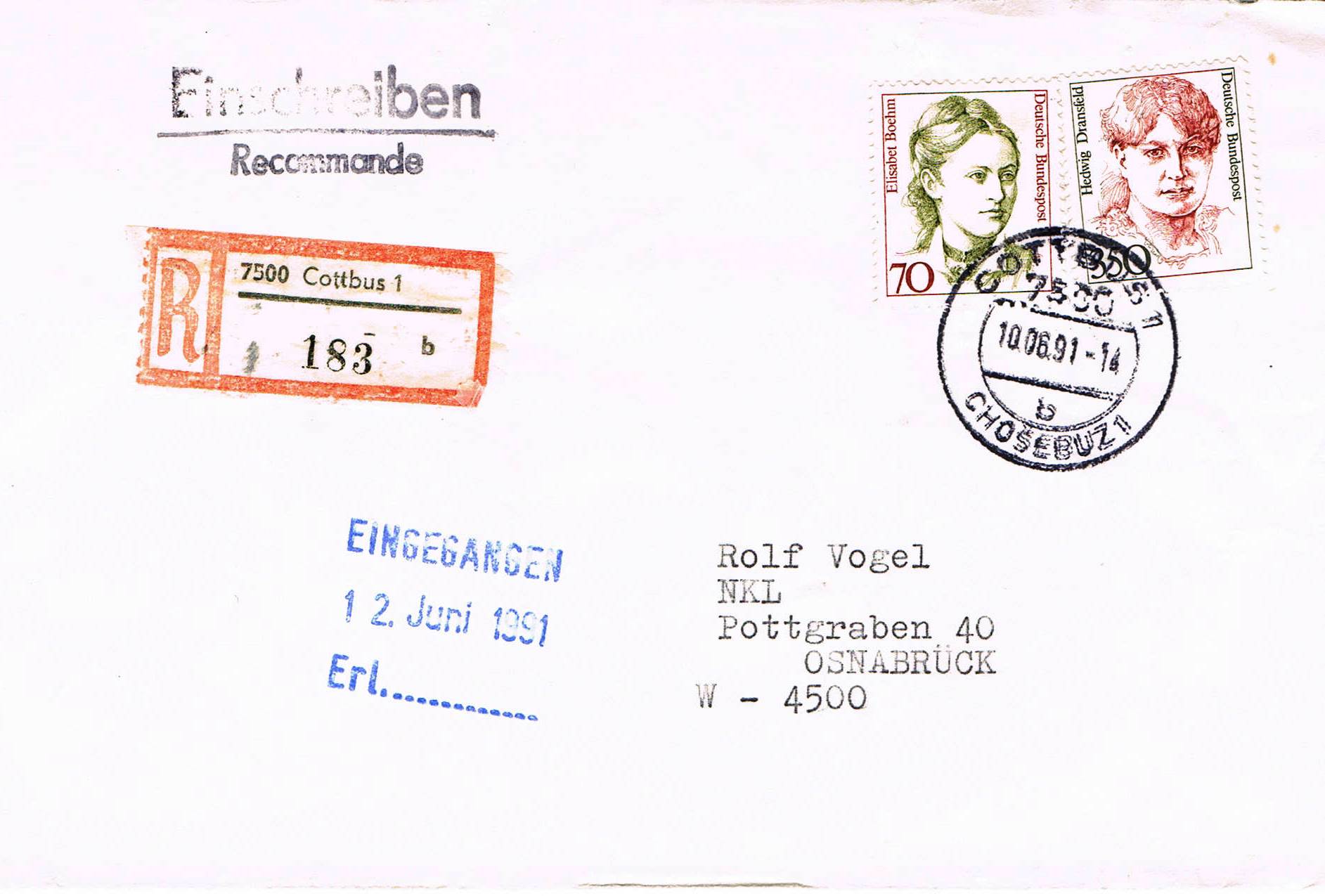 hier ein R-Brief aus Cottbus, ein paar Wochen nach Ende der VGO-Zeit, als schon die "West-Tarife" galten (10.6.1991)