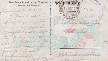 Ab 29.1.1915 bis 29.2.1916 übernahm sie Stellungskämpfe im Oberelsass, das steht auch in der Karte als Absendeort, wohl in Mülhausen und Umgebung, wie die Ansicht zeigt. Am 2. April 1915 waren Gefechte bei Sennheim, ob die am 13.4., dem Schreibdatum, schon vorbei waren, steht leider nicht bei Wikipedia.