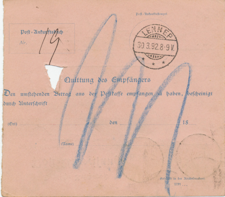 Nachdem dies geschehen war ging der Umschlag wieder zum Postamt zurück und die angenommenen Postanweisungen wurden auf der Rückseite durch Querstriche in blauer Tinte oder mit Blaustift für eine Quittungsleistung unbenutzbar gemacht (Bild 04). Anschließend wurde von dem betreffenden Empfänger eine Liste der zu überweisenden Beträge erstellt und an die Hauptkasse weitergegeben, welche dann die Gutschrift an die Reichsbankanstalt weitergab.