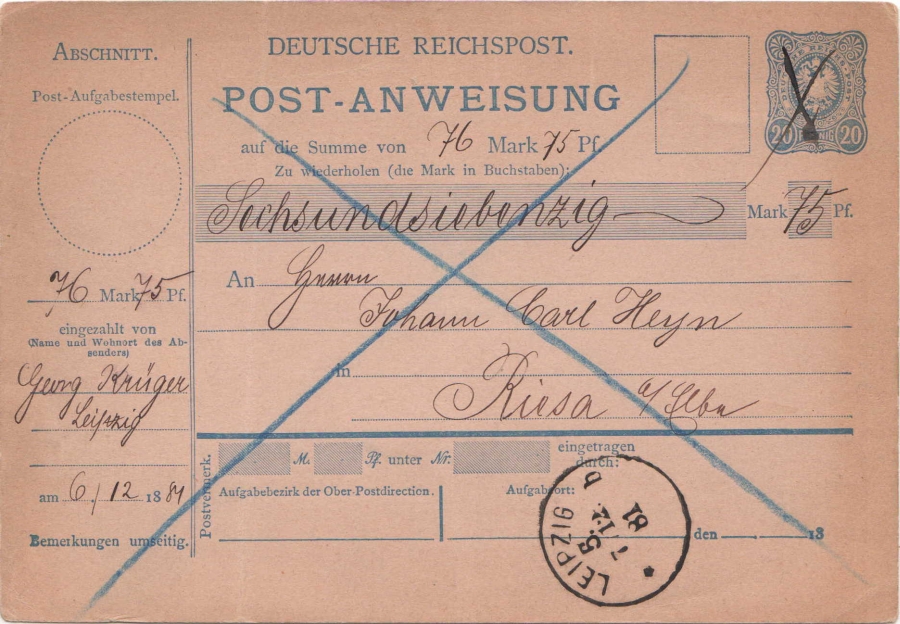 ich habe nach Euren sehr interessanten Belegen auch gleich nach solchen aus Leipzig Ausschau gehalten. So konnte ich nun vor Weihnachten eine Post-Anweisung vom 7.12.1881 über 76,75 Mark von Leipzig nach Riesa erstehen. Interessant finde ich aber auch, dass der Stempel keine Uhrzeitgruppe aufzeigt. Das finde ich für diese Zeit eher ungewöhnlich. Ich frage mich allerdings auch, ob meine Postanweisung den von Euch beschriebenen "normalen" Postweg genommen hat. Weder auf der Vorderseite noch auf der Rückseite ist ein postalischer Vermerk über die Anweisung des Geldes an den Empfänger. Handelt es sich ebenfalls um eine telegraphische Post-Anweisung? Aber hier ist kein entsprechender Vermerk vorhanden. Vielen Dank für Eure Hilfe.