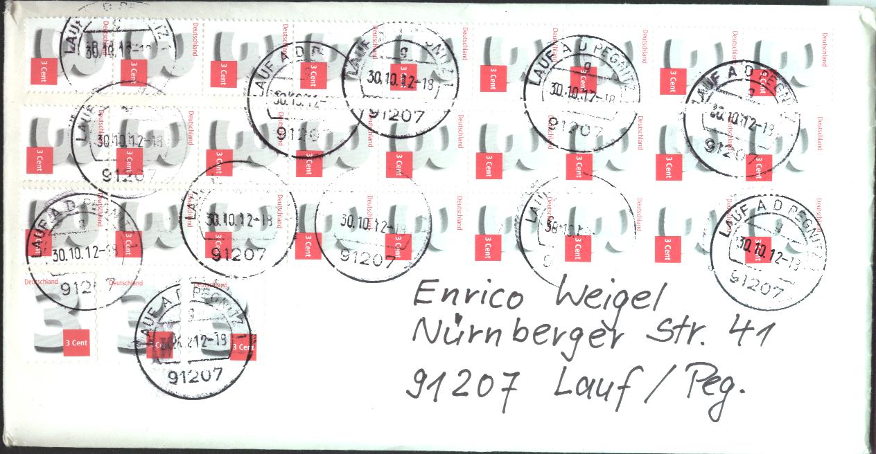 Falls noch vorhanden, wäre ich noch an der 3-Cent-Marke mit Datum 30.10.2012 interessiert, evtl. noch zuadressiert, falls die Marke einen Vollstempel trägt. Wenn nicht, dann bitte eine Marke auf "Zettel" zuschicken.