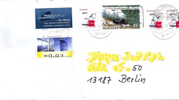 BuntF mit einer Frühverwendung der 3 Cent-Marke, einer Spätverwendung der legendären Philaforum-Vignette und bezeichnend für das heutige Post(un)wesen die doppelte Entwertung.