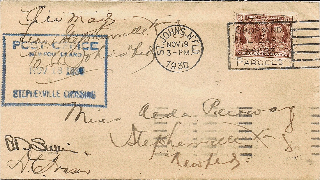 Frankiert wurde der Brief mit einer 3c Marke der Second Publicity Issue, also normales Inlandsbriefporto ohne Zuschlag. Interessant ist, dass der Stempel von Stephenville Crossing links auf de Kuvert abgeschlagen wurde. Die Marke wurde erst bei der Ankunft mit dem Postal Slogan PS8 "Shop and / Mail Early / Insure / Parcels" am 19.11.1930 entwertet.