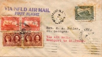 Die Belege sind wohl alle philatelistisch beeinflusst und häufig. Im NSSC werden Sie je nach Zielort als FF28a-n katalogisiert. Zu den weniger häufigen Belegen gehören Luftpostbriefe die in den Outports nach St. Johns aufgegeben wurden, so wie dieser Brief des bekannten neufundländischen Briefmarkenhändlers Rev. E. A. Butler von Westport via St. John's nach St. Georges.