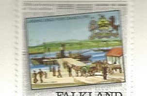 Ersttagsbrief Falkland Inseln 250 Jahre Lloyds Landungssteg Port Stanley, eine Pferdekutsche steht bereit.