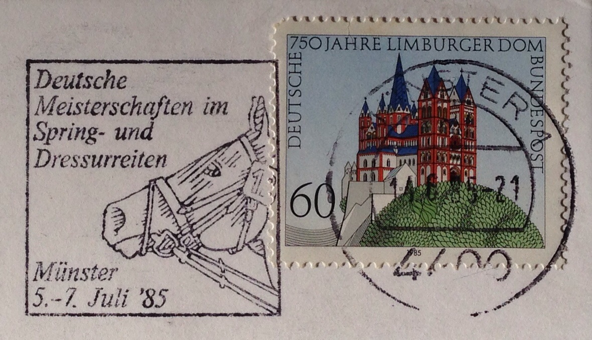 Pferde Stempel Deutsche Meisterschaften im Spring- und Dressurreiten Münster 5.-7. Juli 85 Stempelabschlag Münster 1 14.6.85-21 4400 mf