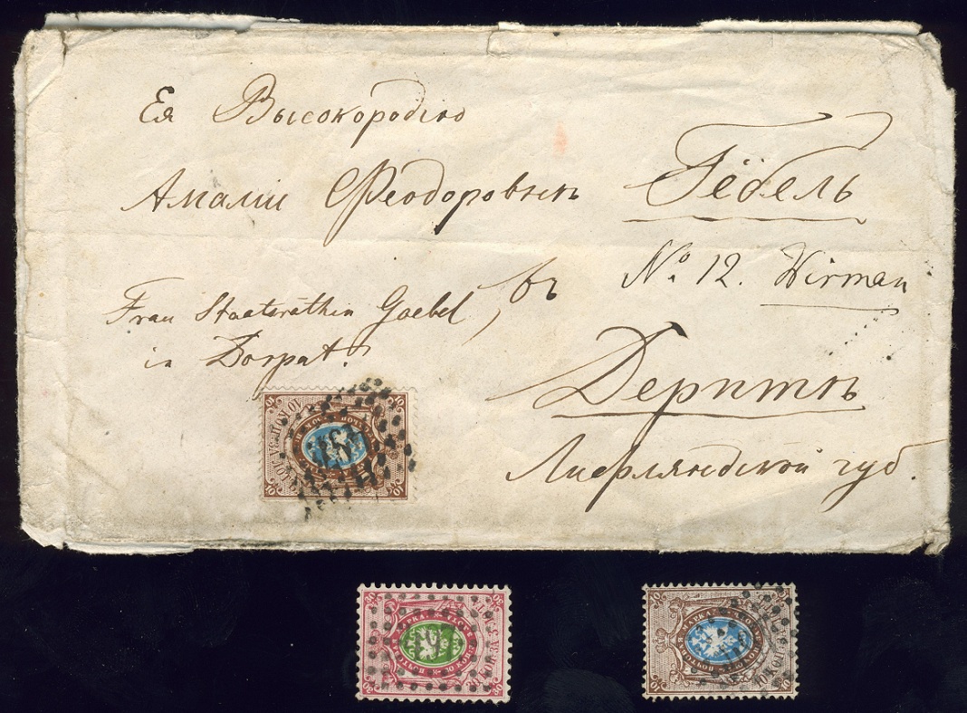 Während lose Marken mit dem rechteckigen Punkt-Nummernstempel "497" noch relativ häufig vorkommen, sind Briefe wie dieser arg ramponierte mit Nr. 2 nach Dorpat schon recht selten.