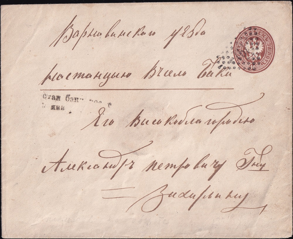 10-Kopeken-Umschlag in braun (Ausgabe 1872) entwertet mit dem Nummernstempel "191" der Poststation DJUKOWO. Diese Station war dem Gebiet Kostroma unterstellt.