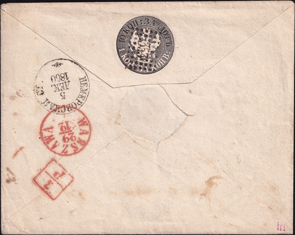 10-Kopeken-Umschlag vom 5. Dezember 1860 nach Warschau. Der Wertstempel ist ebenfalls mit dem Nummernstempel "353" entwertet. Nebengesetzt ist der K1 NEMEROWSKAJA.