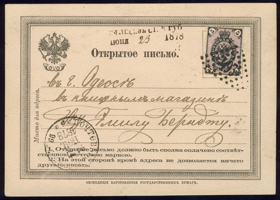 Ein weiteres Beispiel der schlecht lesbaren Zweizeiler und unterschiedlicher Bezeichnungen: Postkarte mit 5 Kopeken (um eine Kopeke überfrankiert) entwertet mit Punkt-Nummernstempel "493" nach Odessa. Nebenstempel der Zweizeiler KEFLESKaJA S... GUB(ERNYA) - JUN 23 1878 sowie Bahnpoststempel. In gängigen Handbüchern wird der Ort mit KAWKASKAJA angegeben.