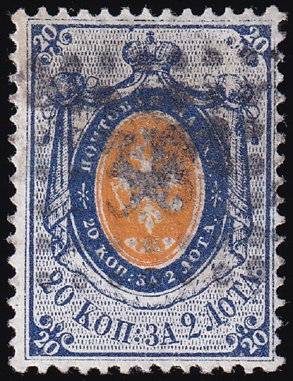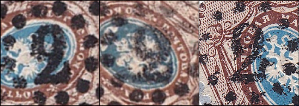 Auch eine Nr. 2 konnte ich bekommen. Die Marke ist mit einem roten, rechteckigen Nummernstempel "145" entwertet. Diese Nummer gehörte zur Kreisstadt SPASK im Gebiet Kasan. Trotz einiger stumpfer Zähne ist es ein sehr ansprechendes Stück, da der Stempel sehr selten ist. In dieser Farbe ist mir die Nummer nur noch auf einer Nr. 1 bekannt.