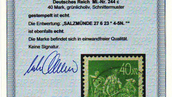 habe heute meine Prüfsendung zurück erhalten, welche ich vor ein paar Wochen zum Infla Prüfer gesandt habe. Dabei eine 244c mit Attest "Einwandfrei". Diese ist nun ein Highlight in meiner Sammlung.