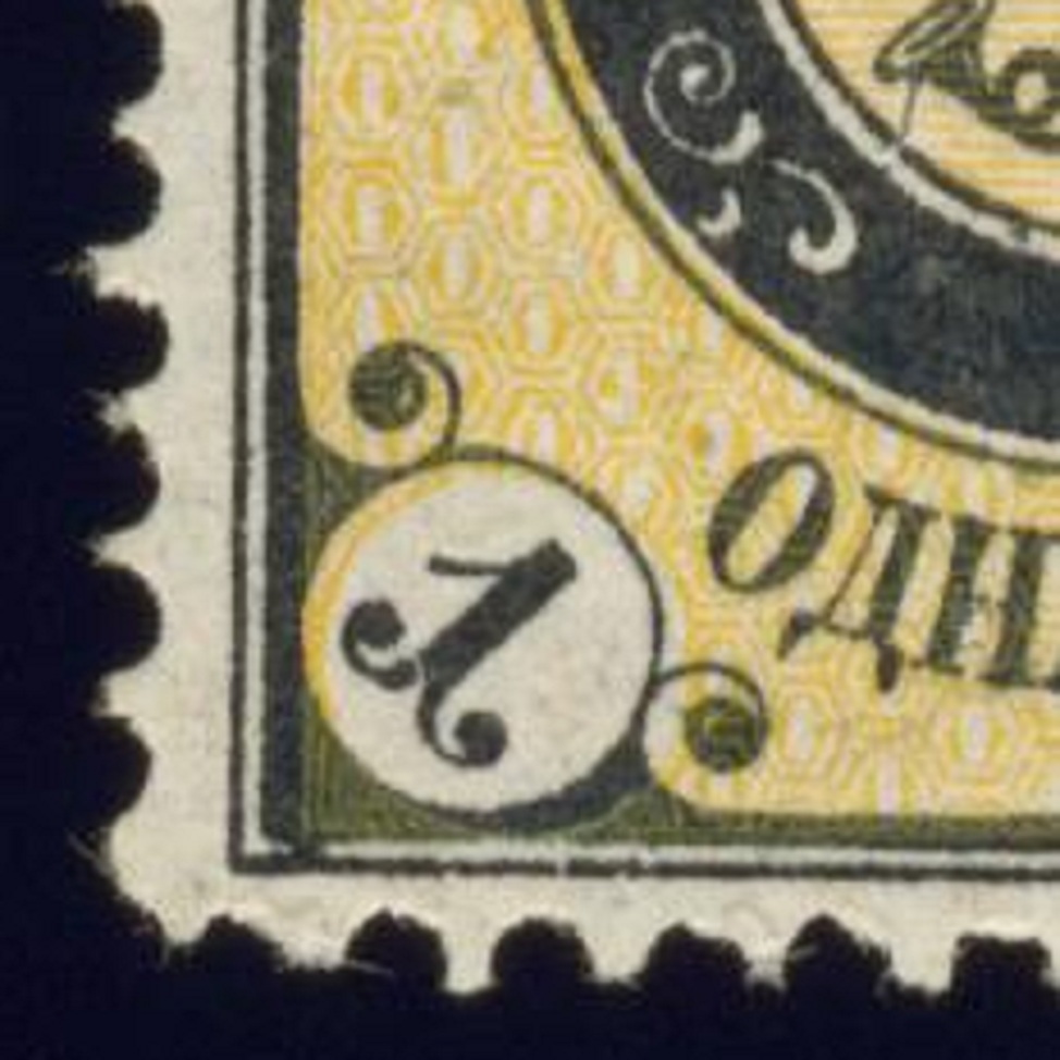 Ich will auf das eingehen, was man dort nicht nachlesen kann. Es geht um die Wappenmarken der Ausgaben 1864 - 1875, genauer gesagt um die 1-, 3-, 5-Kopekenmarken sowie die 2-Kopekenmarke Michel-Nr. 24 vom 18.6.1875. Möglich macht diese Besonderheit der zweifarbige Druck. Dabei wurde zunächst ein farbiger Unterdruck aufgetragen. Anschließend wurde der Rahmen mit den Ziffern der Wertangabe in den vier Ecken sowie ein gekröntes Mitteloval mit doppelköpfigen Adler gedruckt. Diese Druckreihenfolge wurde teilweise vertauscht, da bei einigen Bögen der Unterdruck fehlte. Das Papier war nicht gerade billig. Daher wurde der Unterdruck dann auf den Rahmen gedruckt.