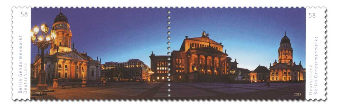 Es handelt sich um einen Zusammendruck, der am 7.2.2013 von der Deutschen Post verausgabt wird. Er zeigt unter dem Titel "Deutschlands schönste Panoramen" den Gendarmenmarkt in Berlin mit 2 Werten zu je 58 Cent. Von einer Gemeinschaftsausgabe ist da nicht die Rede. ![]()