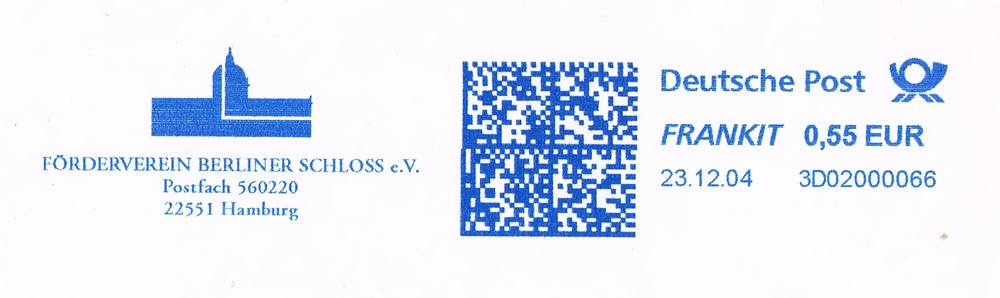 Maßgeblich beteiligt am Vorhaben „Schloßreplik" ist der Absender in diesem Frankit vom 23.12.04. Es fehlen zwar noch einige Millionen an der aufzubringendem Summe, zu der sich der Förderverein verpflichtet hat. Wie Heckinios Foto (10 Jahr später aufgenommen) zeigt, steht der Rohbau inzwischen präzise im Zeitplan und innerhalb der geplanten Kosten.