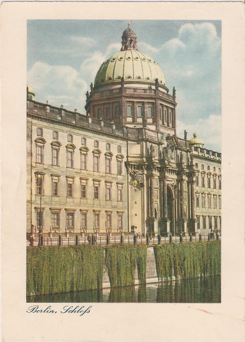 Hier ein Blick auf das Stadtschloss aus östlicher Richtung, noch mit der Originalbebauung auf dem Areal, dass zu DDR-Zeit zum Marx-Engels-Forum wurde.