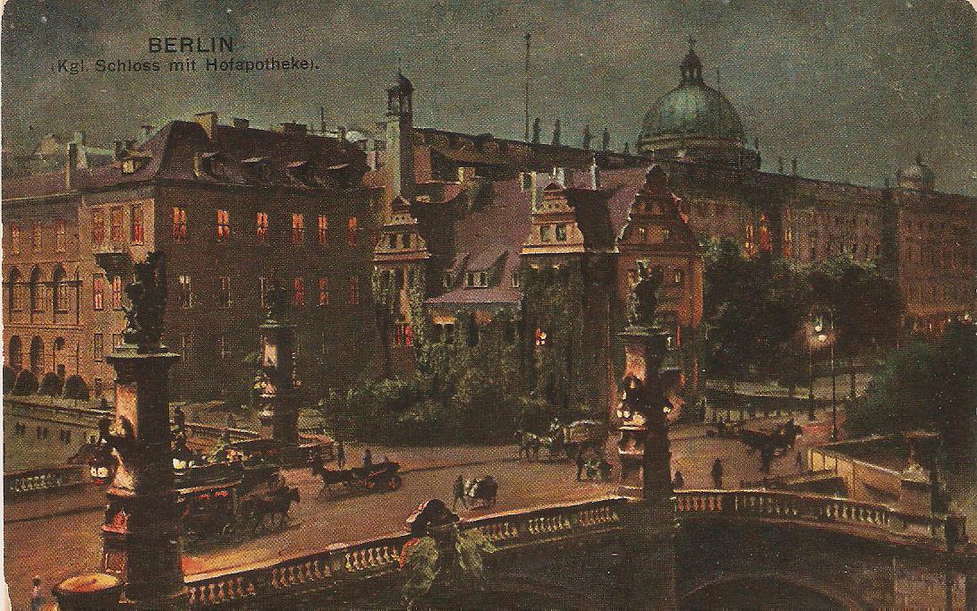Hier ein Blick auf das Stadtschloss aus östlicher Richtung, noch mit der Originalbebauung auf dem Areal, dass zu DDR-Zeit zum Marx-Engels-Forum wurde.