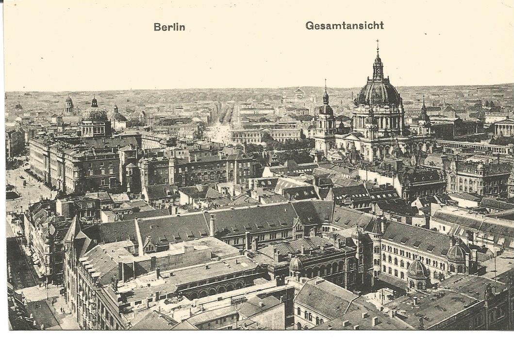 Hier ein Blick auf das Stadtschloss aus östlicher Richtung, noch mit der Originalbebauung auf dem Areal, dass zu DDR-Zeit zum Marx-Engels-Forum wurde.