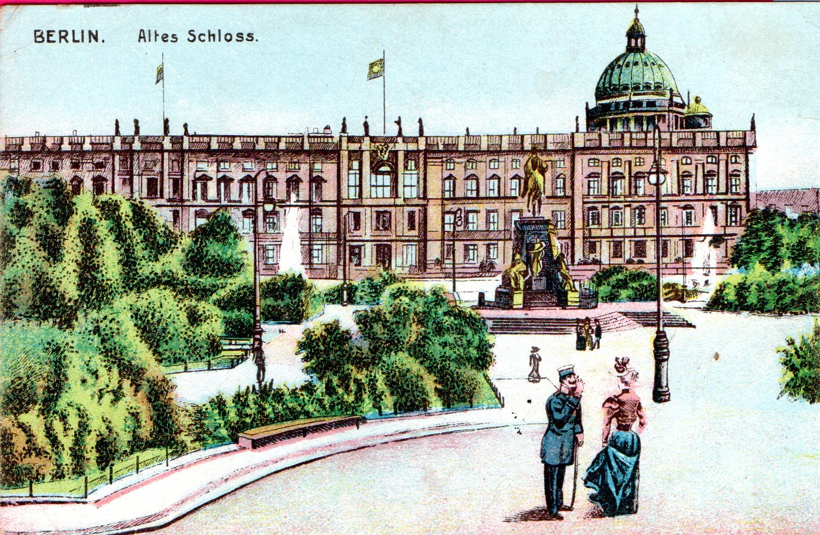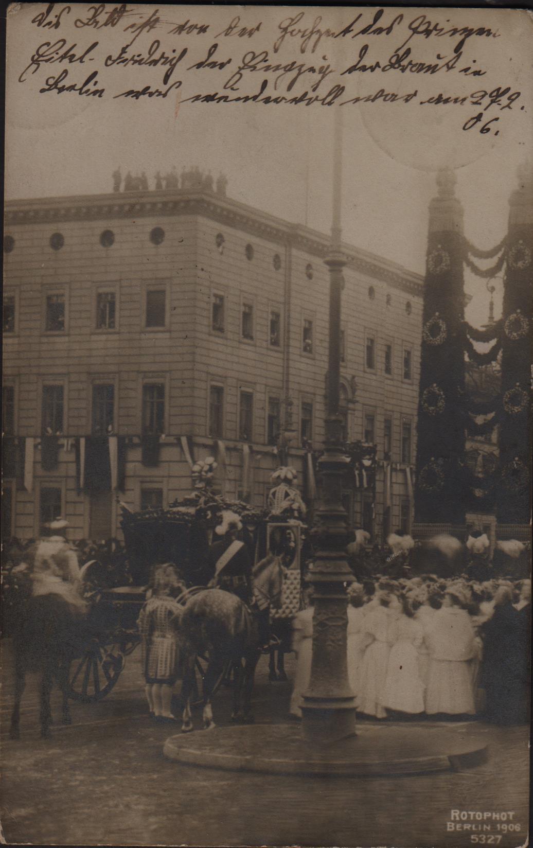 Der zweite Sohn des deutschen Kaisers Wilhelm II., Prinz Eitel Friedrich, heiratete am 27.2.1906 in Berlin Sophie Charlotte von Oldenburg. Die Ansichtskarte zeigt den Einzug der Braut in Berlin vor einem Teil des königlichen Stadtschlosses.