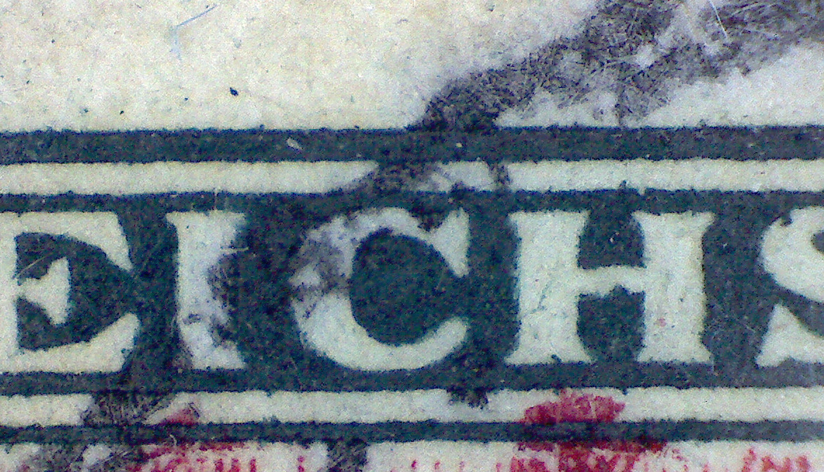 Tippe bei deiner Marke eher auf die Stempelfarbe, die diese Ausbuchtung im "C" vortäuscht.