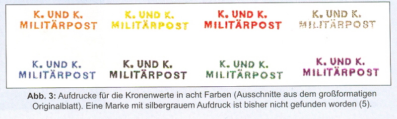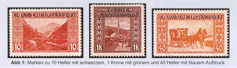 "K. UND K. MILITÄRPOST" verbergen ließ. Diese Vorgänge sind in kürzlich aufgefundenen Akten des Kriegsministeriums dokumentiert. Bei den gelegentlich angebotenen Einzelstücken oder Sätzen von Landschaftsmarken mit verschiedenfarbigen Aufdrucken "K. UND K. MILITÄRPOST" (Abb. 1) handelt es sich also um amtlich angeordnete Probedrucke.