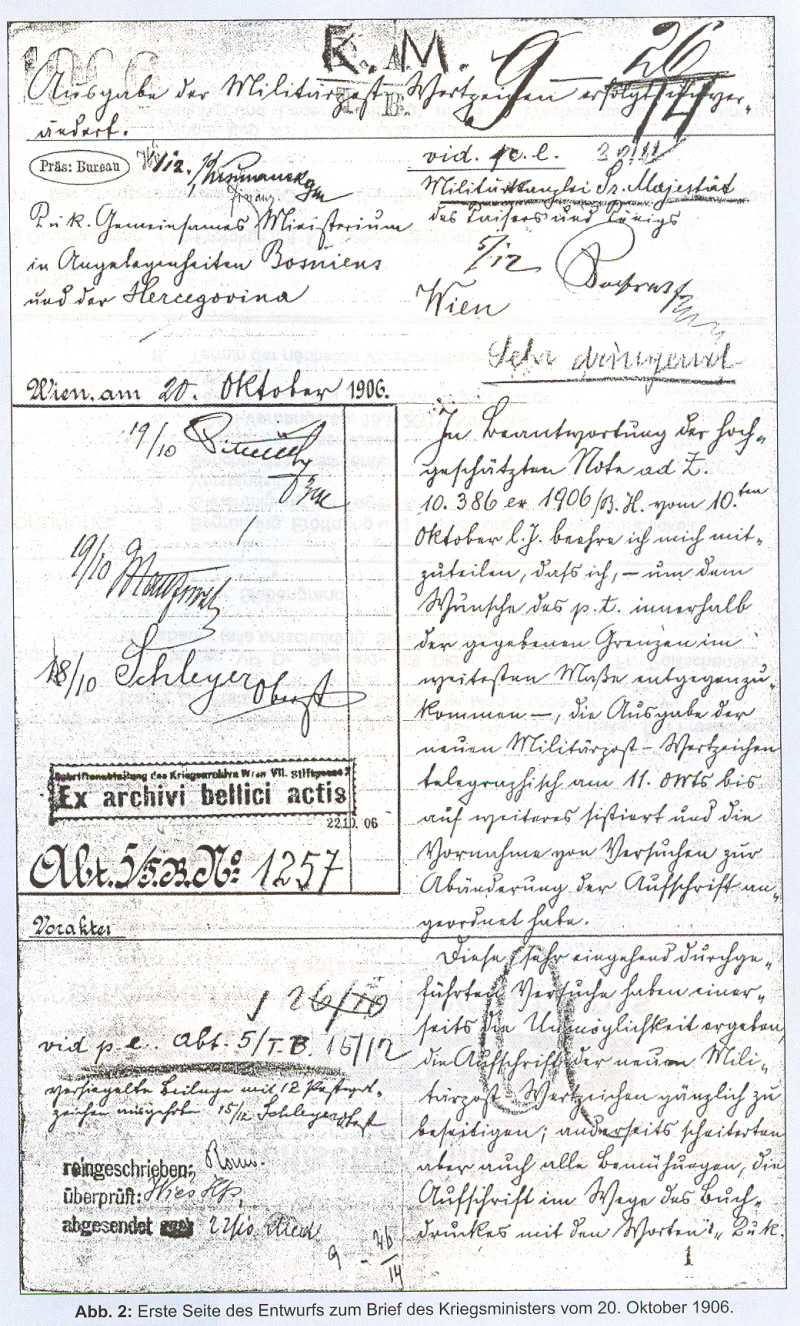 Die Aufschrift ,Bosnien-Herzegowina’ in deutscher Sprache wird voraussichtlich zu vielfachen Rekriminationen Anlass geben, da es jedenfalls passender gewesen wäre, die Landessprache in beiden Schriftarten zur Aufschrift zu benützen, als die deutsche Sprache, welche wohl die ausschließliche Amtssprache der Kriegsverwaltung, keinesfalls aber jene der bosn-herc. Verwaltung ist.
