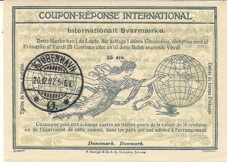 Hier jetzt ein dänischer 40 Öre ( = 40c) Antwortschein im Muster Stockholm. Diese Scheine wurden am 1.11.1925 eingeführt (gemäß Officielle Meddelelser 45/1925).