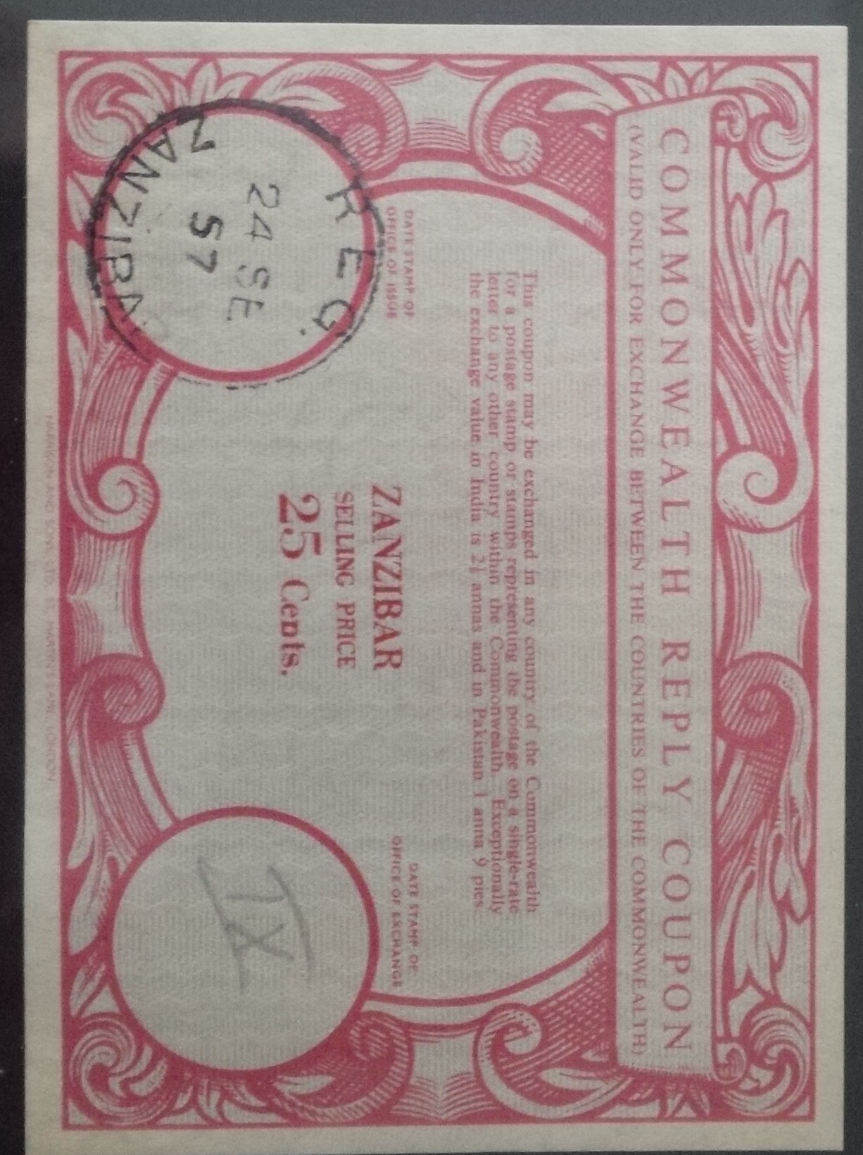 saeckingen hatte ja schon zum Anfang einen Imperial Reply Coupon von Sansibar vorgestellt, dann möchte ich heute noch die modernere Variante ,den Commonwealth Reply Coupon aus Sansibar zeigen ,abgestempelt am 24. September 1957.
